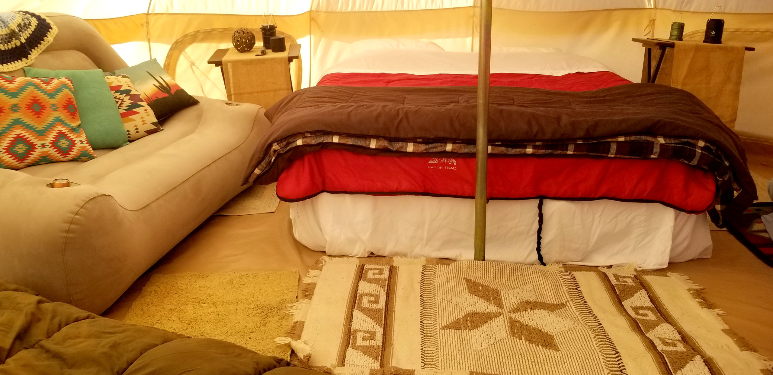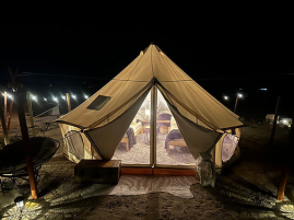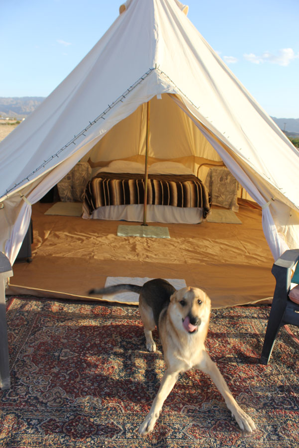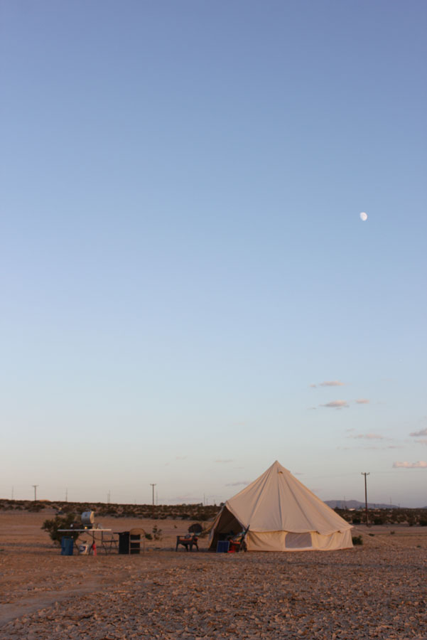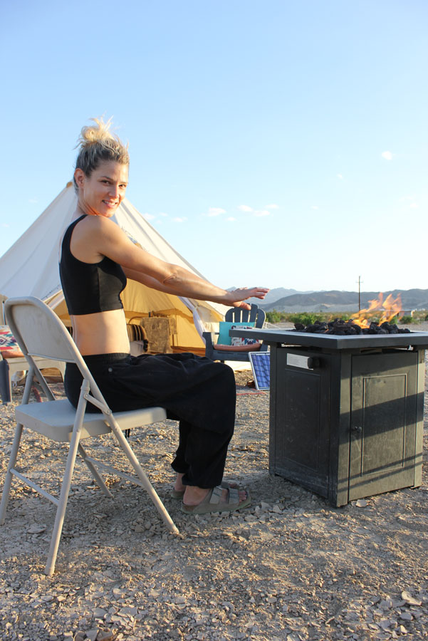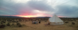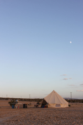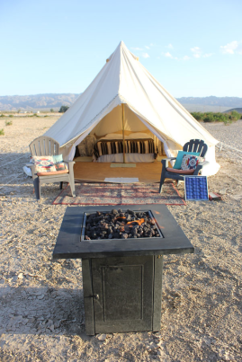Joshua Tree glamping hits differently in a bell-tent yurt! We provide everything you need for safe and comfortable glamping experience just north of Joshua Tree National Park. Included in your fully set-up gear rental is a 15′ yurt bell tent, a table, chairs, and fire-pit. Also included is access to the community facilities which include a heated/cooled club house, an outdoor grill, cooking gear, full bathrooms with hot water and showers. Seasonally we provide a portable water mister / fan and a shade structure for summer. We also have a hot-tub on site for $30 per day to cover heating and cleaning. Additional seasonal options (please inquire) include portable heaters or fans.