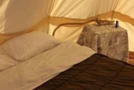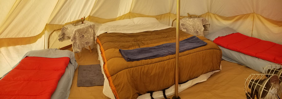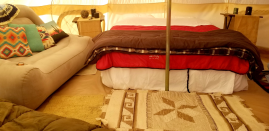 Our guests can choose from one of our four bell tents. Each one is comfortably furnished and comes with a private fire-pit gazebo, and picnic table.